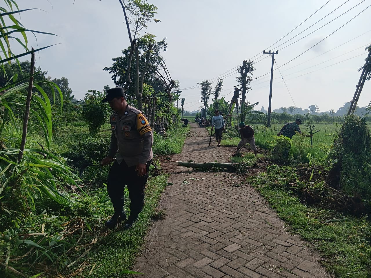Bhabinkamtibmas Desa Begendeng Polsek Jatikalen Polres Nganjuk Aiptu Wahyu dengan Babinsa Desa Begendeng Serka Saiful Naim melaksanakan kerja bakti bersama warga membersihkan jalan kampung serta membersihkan gorong gorong atau saluran air di wilayah setempat.