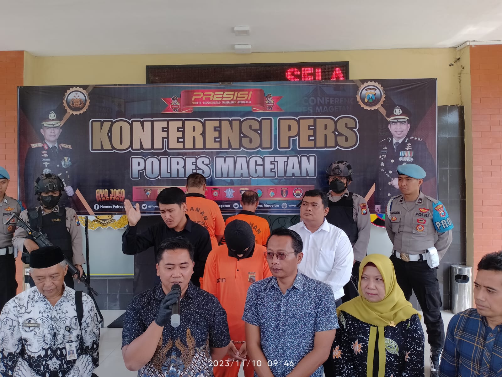 “Kami yang mendapat laporan segera mencari pelaku dan ternyata pelaku masih di kawasan Kecamatan Plaosan, Magetan. Saat kami cek ke hotel, ternyata topi pelaku masih tertinggal di kamar hotel. Kemudian, pelaku kami amankan di Mako Polres Magetan,” kata Angga saat rilis kasus di Mako Polres Magetan, Jumat (10/11/2023).
