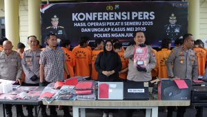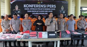Nganjuk, MHI – Polres Nganjuk berhasil mengungkap 47 kasus tindak pidana dan mengamankan 63 tersangka dalam dua golongan kegiatan, yakni hasil Operasi Pekat II Semeru 2025 yang berlangsung pada 1–14 Mei serta pengungkapan kasus reguler sepanjang Januari hingga Mei 2025. Capaian ini disampaikan dalam konferensi pers di Mapolres Nganjuk, Jumat (16/5/2025).