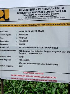 BLITAR,MHI – Program Percepatan Peningkatan Tata Guna Air Irigasi (P3-TGAI) di Desa Ngoran, Kecamatan Ngegok, Kabupaten Blitar, yang dibiayai Anggaran Pendapatan dan Belanja Negara (APBN) sebesar Rp 195 Juta, tengah menjadi sorotan tajam dari masyarakat setempat. Proyek yang dilaksanakan oleh Himpunan Petani Pemakai Air (HIPPA) Tirta Mulya Abadi ini diduga dikerjakan secara asal-asalan dan tidak memenuhi standar kualitas mutu yang ditetapkan.