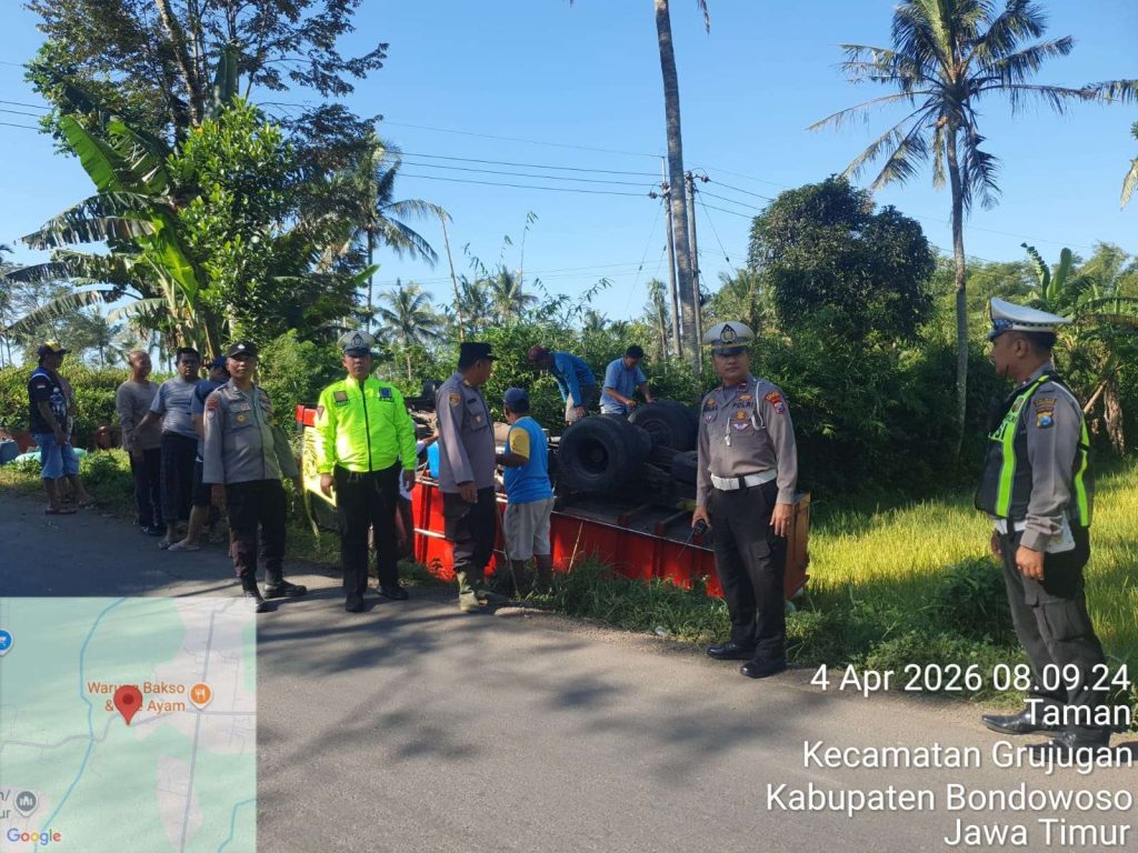 Posisi truk terguling ke sawah di sisi barat jalan dengan bagian roda berada di atas. Diketahui truk bernomor polisi N 8621 BE, di kendarai oleh Antok, 40, warga Balung Kabupaten Jember. Pada sabtu dini hari (04/04) Antok berangkat mengirim gabah dari balung menuju arak-arak bersama seorang keneknya.